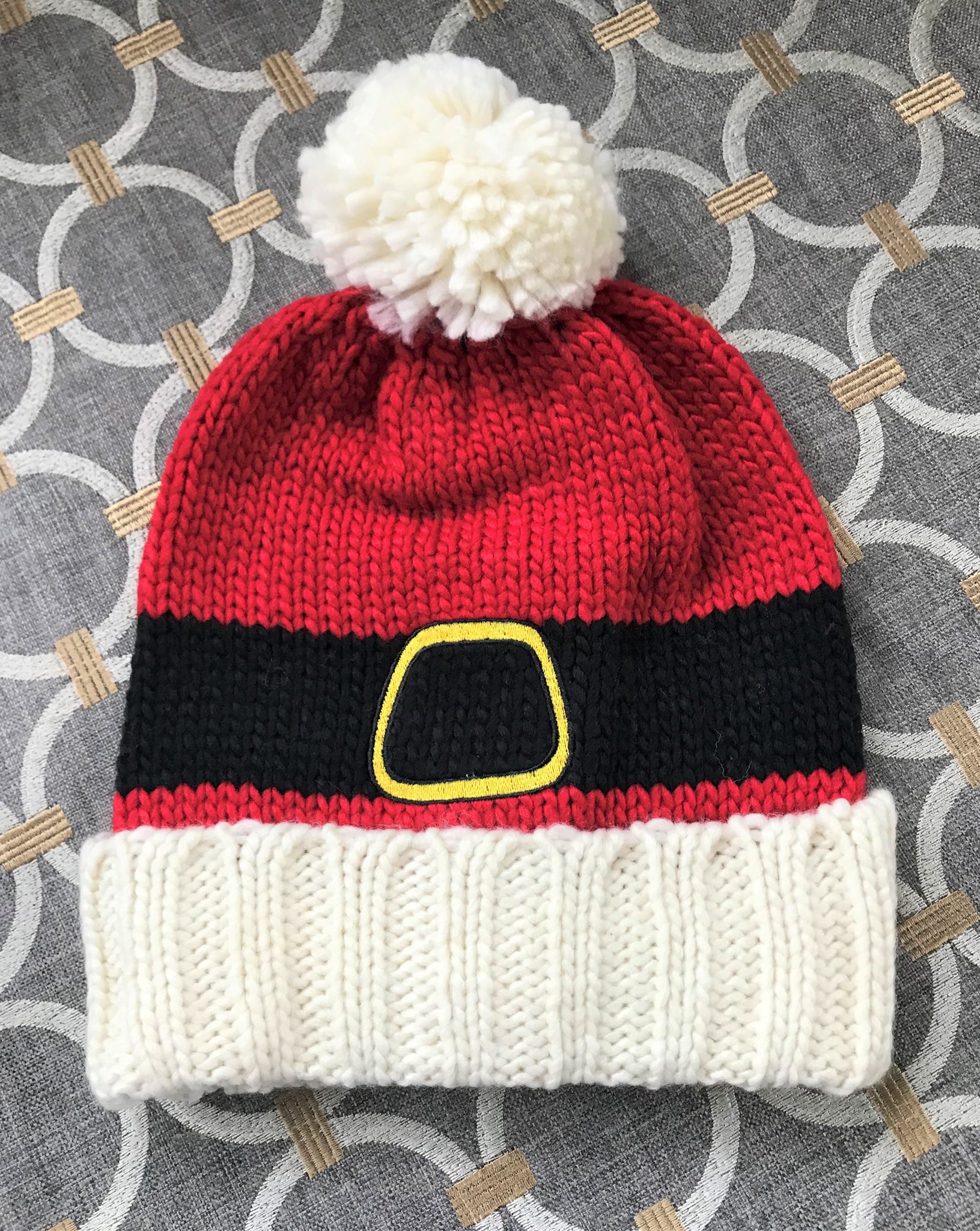 this fun-looking holiday hat is so adorable. it mimics santa's red suit, black belt, and gold buckle, finished off with cream-colored bottom edge and poofy pom ball on top. the belt buckle being embroidered adds to the texture and overall beauty and quality.